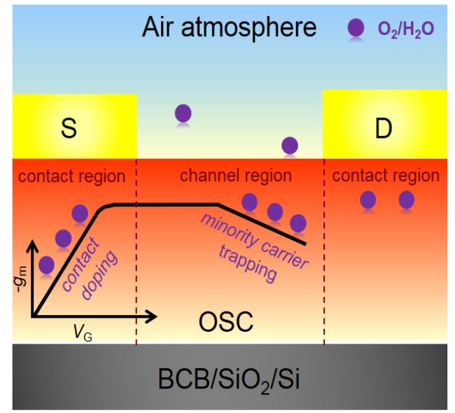 Organic field-effect transistors (OFETs)often deviate from ideal behaviors in air, which masks their intrinsicproperties and thus significantly impedes their practical applications. A keyissue of how the presence of air affects the ideality of OFETs has not yet beenfully understood. It is revealed that air atmosphere may exert a double-edgedsword effect on the active semiconductor layer when determining the ideality ofOFETs fabricated from p-type crystalline organic semiconductors. Upon exposingthe as fabricated device to air, water and oxygen mainly function as efficientp-type dopants for the active layer in the contact regions, enhancing chargecarrier injection and consequently improving device ideality. Nevertheless, asthe exposure time increases, the trapping centers for the injected minoritycharge carriers appear in the channel region, leading to degradation of deviceideality. Inspired by the double-edged sword behavior of air, a near-ideal OFETis achieved by ingeniously utilizing the doping/positive effect and eliminatingthe trapping/negative effect. The effect of air on the ideality of p-type OFETsis clarified, which not only illuminates some common observations of OFETs inair but also offers useful guidance for the construction of high-performanceideal OFETs.
