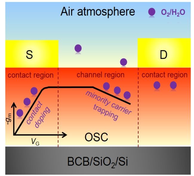 由于空气气氛中活性组分(水和氧气)的存在,有机场效应晶体管经常会在空气中展现出非理想行为。现有的理想性研究主要集中于吸附在绝缘层界面上的水和氧气的作用,并认为其会通过界面电荷捕获,从而对器件的理想行为产生负面影响。但是,关于水和氧气对有机材料本身直接作用,从而对器件理想性产生的影响目前仍然鲜有关注。因此,空气气氛影响有机场效应晶体管器件理想性的机制仍亟待研究。