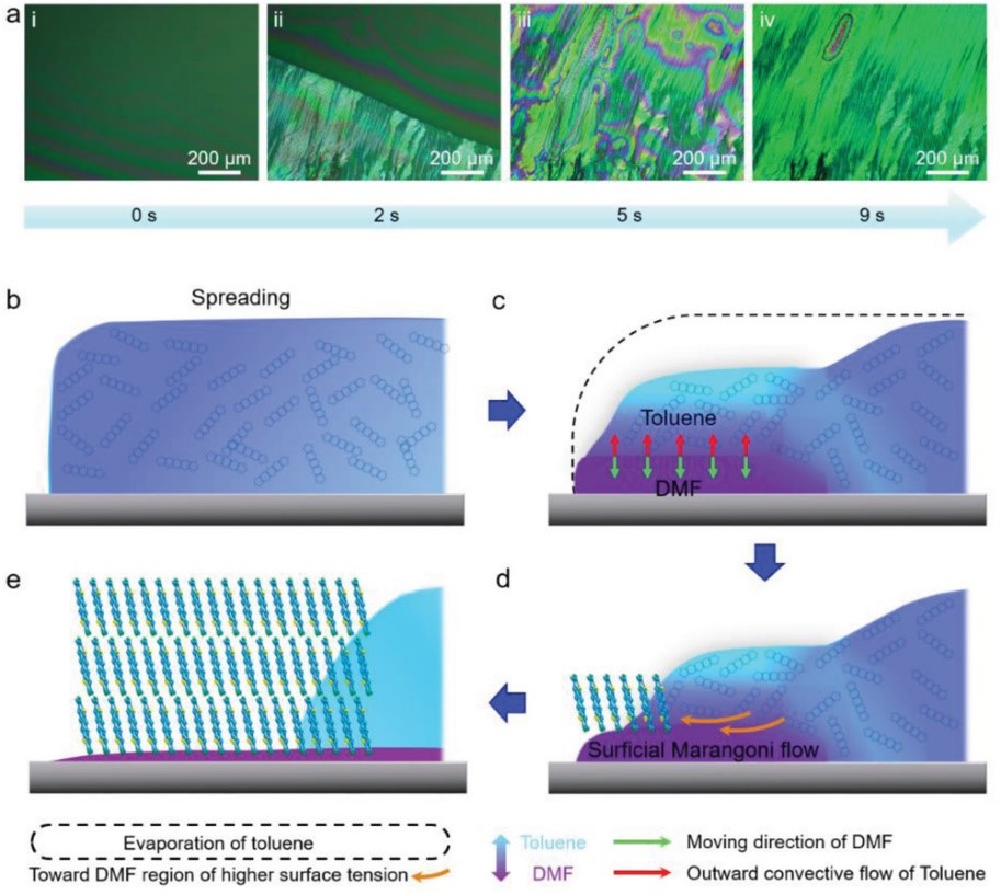 2Dmolecular crystals (2DMCs) are emerging as excellent candidates for theapplication of organic field‐effect transistors (OFETs), owing to theirenhanced charge transport efficiency and long‐range molecular ordering.However, many current methods involve an additional transfer process, whichlargely hinders the large‐area fabrication of high‐quality, intact 2DMCs forpractical applications. Here, an efficient surficial Marangoni flow‐inducedself‐assembly (SMFIS) method is developed for the fabrication of 2DMCs directlyon target substrates without the need of a transfer process. This methodutilizes a solvent/antisolvent system to confine the crystallization field at aliquid/air interface, and then the formed 2DMCs land on the target substratewith the full solvent evaporation. By controlling the vertical convection flowand the spreading coefficient of the solvent/antisolvent system, few‐layer (3–4layers) 2DMCs are directly produced on the target substrates. The SMFIS methodshows no substrate dependency and universal compatibility. Withbis(triethylsilylethynyl)anthradithiophene (Dif‐TES‐ADT) as an example, theresulting 2D Dif‐TES‐ADT crystal exhibits an efficient charge transport withhigh average mobility up to 2.15 cm2 V−1 s−1.The proposed method with general applicability has great potential to bedeveloped as a platform for the growth of high‐quality 2DMCs on the targetsubstrate.