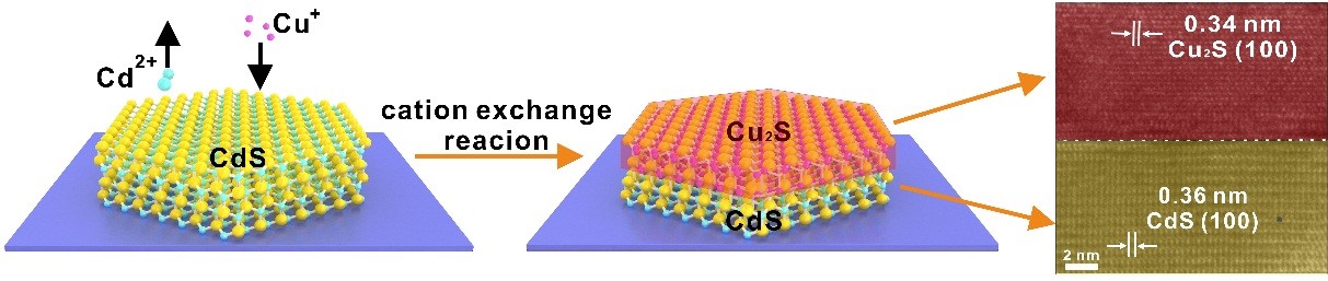 Two-dimensional (2D) vertical heterojunctions possess peculiar electronic and optoelectronic properties according to their complementary composition, ultrathin thickness, and unique geometry. However, it is still a challenge to synthesize 2D vertical heterojunctions based on non-layered materials due to strong covalent bonds and abundant surface dangling bonds. Here we developed a partial cation exchange method for the synthesis of 2D vertical Cu2S/CdS heterojunctions. Large-size and single-crystalline CdS nanosheets prepared by a van der Waals epitaxy method served as host lattices for cation exchange reactions. The evolution of the nanosheets in terms of their morphology, composition and crystal structure was elaborately characterized. The as-prepared 2D vertical heterojunctions have two-layer ultra-thin structures and form large-area junctions at their interfaces. Under light irradiation, the photogenerated electron–hole pairs can be quickly separated under the electric field in the junction region, minimizing the possibility of charge recombination. As a result, the device based on 2D vertical Cu2S/CdS heterojunctions exhibits a higher photoelectric conversion capability compared with the device based on single-component 2D CdS or Cu2S Schottky junctions. Our work opens up opportunities to explore 2D vertical heterojunctions based on non-layered materials for highperformance optoelectronic devices.