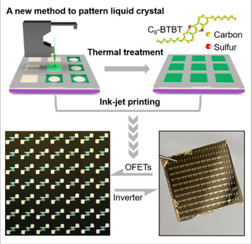 Liquid crystalline (LC) organic semiconductorshaving long‐range‐ordered LC phases hold great application potential in organicfield‐effect transistors (OFETs). However, to meet real device applicationrequirements, it is a prerequisite to precisely pattern the LC film at desiredpositions. Here, a facile method that combines the technique of inkjet printingand melt processing to fabricate patterned LC film for achievinghigh‐performance organic integrated circuits is demonstrated. Inkjet printingcontrols the deposition locations of the LC materials, while the meltprocessing implements phase transition of the LC materials to form high‐qualityLC films with large grain sizes. This approach enables to achieve patternedgrowth of high‐quality 2,7‐dioctyl[1]‐benzothieno[3,2‐b][1]benzothiophene(C8‐BTBT) LC films. The patterned C8‐BTBT LC film‐based 7 × 7 OFET array has100% die yield and shows high average mobility of 6.31 cm2 V−1 s−1, along with maximum mobility up to 9.33 cm2 V−1 s−1. As a result, the inverters based on the patterned LC filmsreach a high gain up to 23.75 as well as an ultrahigh noise margin over 81.3%.Given the good generality of the patterning process and the high quality of theresulting films, the proposed method paves the way for high‐performance organicintegrated devices.