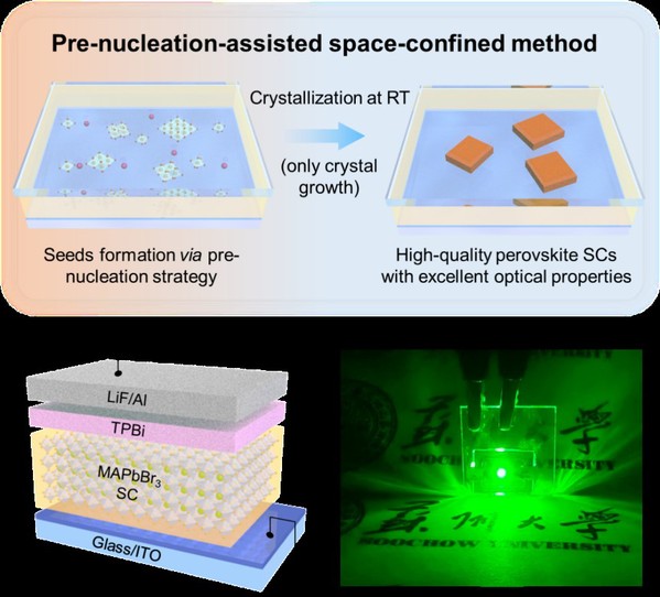 Metal lead perovskite (MHP) single crystals (SCs) with extraordinary optical properties are promising candidates for high-performance SC-based perovskite light-emitting diodes (SC-PeLEDs). However, the heating process involved in traditional methods to initiate crystal nucleation and growth inevitably induces massive defects in MHP SCs, leading to inferior electroluminescence performance and poor operational stability of the SC-PeLEDs. Preparation of low-defect thin MHP SCs for high-performance SC-PeLEDs remains a formidable challenge. Here, a facile pre-nucleation strategy is developed to enable room-temperature (RT) growth of high-quality MAPbBr3 (MA+ = CH3NH3+) SCs. By avoiding the detrimental effect of high growth temperature, the MAPbBr3 SCs prepared at RT show improved crystallinity with lower trap-state density, giving rise to higher photoluminescence quantum yield and uniform fluorescence. Consequently, the MAPbBr3-based SC-PeLEDs achieve a high external quantum efficiency up to 9.7%, along with an ultrahigh luminance of 126 800 cd m−2, which is among the highest for MAPbBr3-based SC-PeLEDs. Moreover, the SC-PeLEDs demonstrate remarkably high operational stability with half-lifetimes as long as 594 min and 33.2 min at initial luminances of ≈1000 cd m−2 and ≈10 000 cd m−2, respectively. The work has excellent universality and paves the way toward the fabrication of high-performance SC-PeLEDs for future lighting, display, and laser applications.
