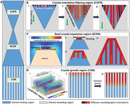 Abstract:Organic single-crystal films (OSCFs) provide an unprecedented opportunity for the development of new-generation organic single-crystal electronics. However, crystallization of organic films is normally governed by stochastic nucleation and incoherent growth, posing a formidable challenge to grow large-sized OSCFs. Here, an “orientation filter funnel” concept is presented for the scalable growth of OSCFs with well-aligned, singly orientated crystals. By rationally designing solvent wetting/dewetting patterns on the substrate, this approach can produce seed crystals with the same crystallographic orientation and then maintain epitaxial growth of these crystals, enabling the formation of large-area OSCFs. As a result, this unique concept for crystal growth not only enhances the average mobility of organic film by 4.5-fold but also improves its uniformity of electrical properties, with a low mobility variable coefficient of 9.8%, the new lowest record among organic devices. The method offers a general and scalable route to produce OSCFs toward real-word electronic applications.