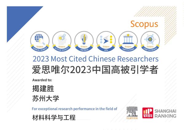 近日,爱思唯尔 (Elsevier) 重磅发布了2023“中国高被引学者” (Highly Cited Chinese Researchers) 榜单,来自496所高校、企业及科研机构的5801位学者入选。苏州大学共33位学者进入榜单,其中纳米学院入选者10人。课题组负责人揭建胜教授入选该榜单。