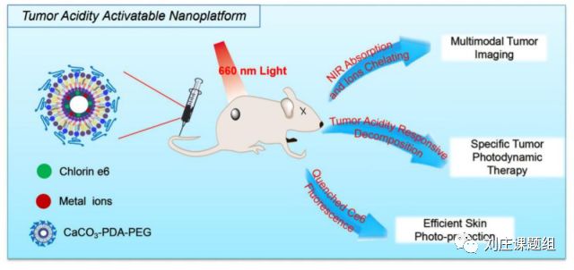 鉴于此,我们以多巴胺(PDA)为介导,通过气相扩散反应一步法合成了尺寸均一的空心碳酸钙-聚多巴胺(CaCO3-PDA)纳米复合物,并以此为基础构建了肿瘤可激活性纳米诊疗平台。由于该纳米颗粒对弱酸具有高度的敏感性,负载的光敏分子二氢卟吩e6(Ce6)在生理环境中被PDA所淬灭,而在弱酸条件下随着纳米材料结构的解离,光动力效果能够不断加强。同时利用多巴胺与多种金属离子 (如Fe3+, Mn2+, Zn2+等)特殊的亲和力,该体系可实现肿瘤的多模态成像。基于该pH响应性的纳米载体,我们最终实现了影像导航下的肿瘤光动力治疗以及有效的皮肤保护。