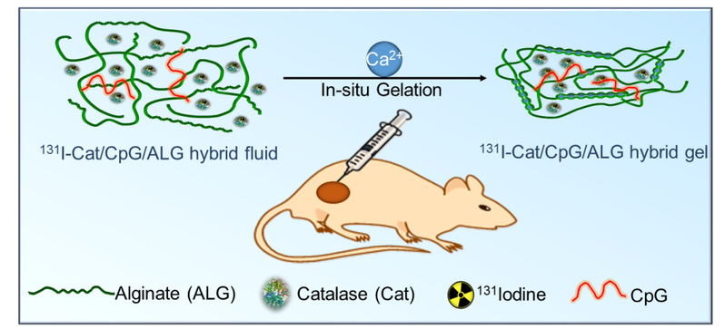 图1、碘131标记的过氧化氢酶(蛋白)、免疫佐剂CpG(核酸)以及海藻酸钠(多糖)复合物肿瘤内局部注射原位成胶示意图。