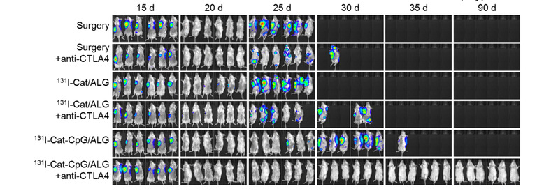 图2、基于生物材料的放射免疫联合治疗可有效抑制肿瘤转移。图中各组小鼠都在第16天接受各种疗法的治疗(包括手术、手术联合免疫治疗、放疗、放疗联合免疫治疗等),虽然第20天时几乎所有组的原位乳腺癌肿瘤都消失了,但除了放射免疫联合治疗组(最后一组)外,其他各组中隐匿的转移肿瘤细胞都导致了后续肿瘤全身转移和小鼠死亡。