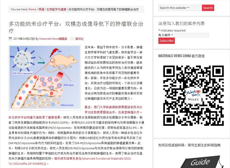 近日,刘庄教授课题组多项发表在Advanced Functional Materials、Advanced Materials等杂志上的科研成果被Materials Views China报道。
