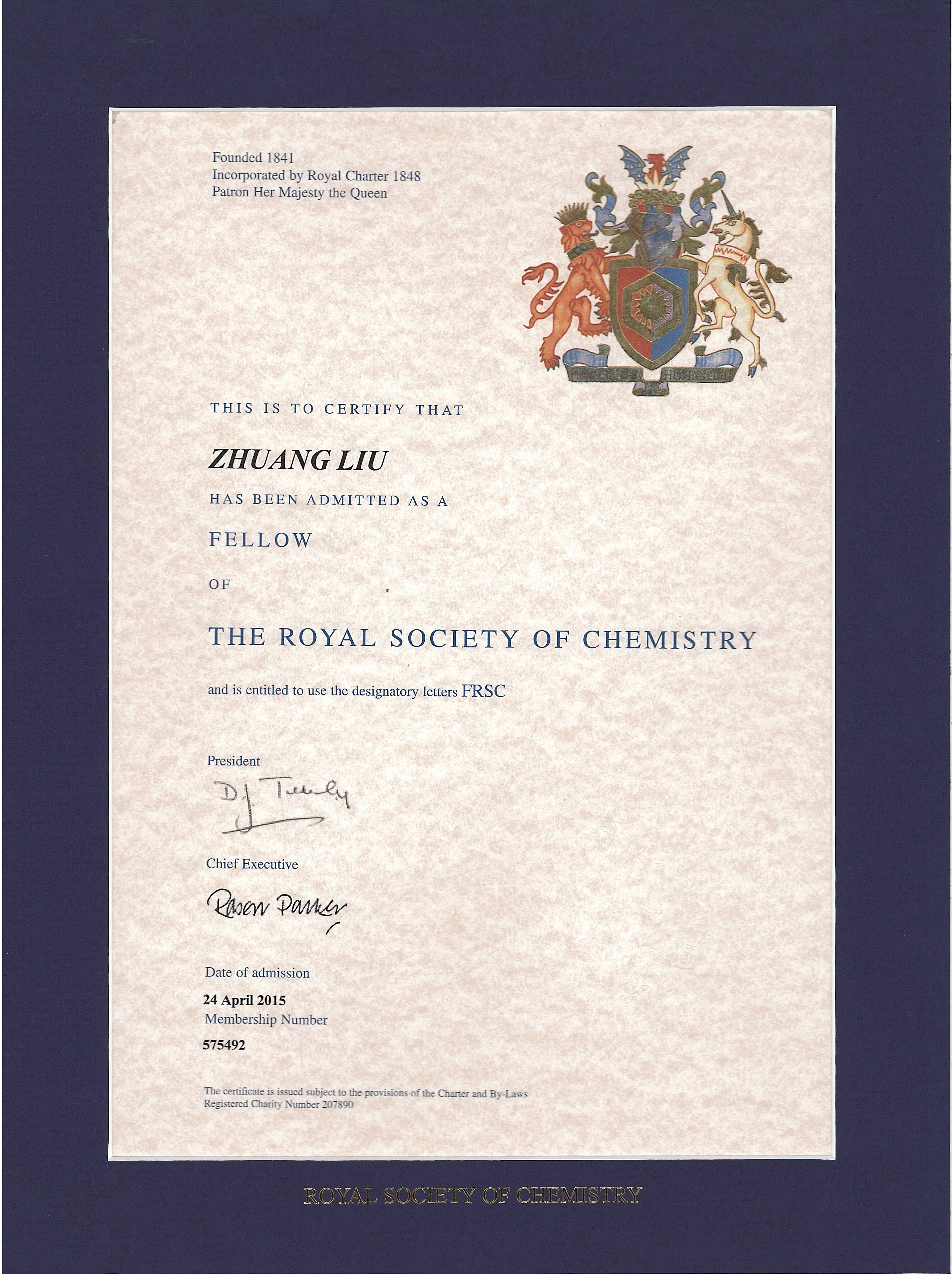 2015年6月,从英国Royal Society of Chemistry (英国皇家化学会,简称RSC)传来消息,我院刘庄教授受邀成为Fellow of the Royal Society of Chemistry(FRSC,中译名:英国皇家化学会会士)。