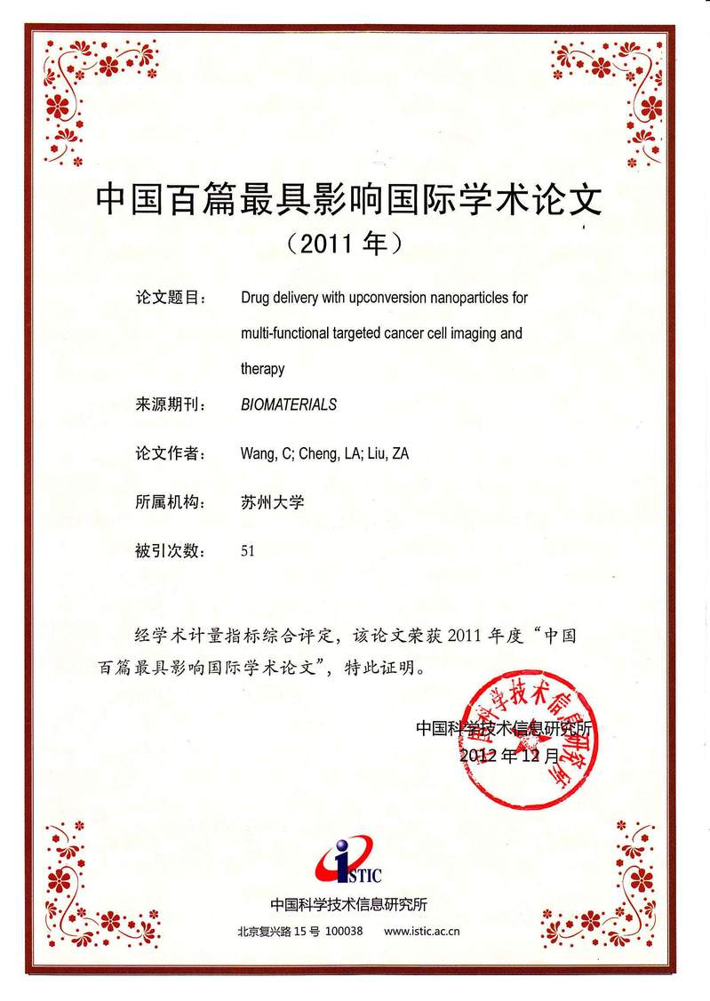 近日从中国科学技术信息研究所获悉,我院刘庄教授课题组于2011年在Biomaterials杂志上发表的一篇关于稀土上转换发光纳米颗粒用于多功能纳米药物载体的论文近日被“中国科学技术信息研究所”评为“2011年中国百篇最具影响国际学术论文”。科技部中国科学技术信息研究所多年来一直从事我国科技论文统计与分析工作,每年对各学科领域内的论文发表、引用、国内外期刊评价等相关信息做权威发布,自2007年起每年度发布上一年“中国百篇最具影响国际学术论文”。
