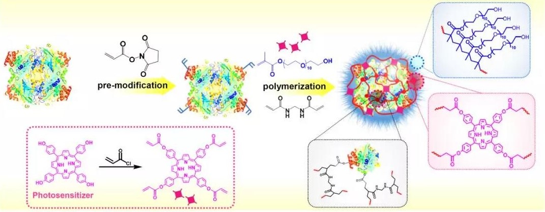 肿瘤部位细胞以及不规则血管异常增殖引起局部含氧量的匮乏,已被认为是限制肿瘤治疗效果的主要原因之一,尤其是对于一些耗氧治疗手段,例如光动力治疗以及放射疗法等。由于肿瘤部位含有较高浓度的过氧化氢H2O2,在本工作中,选取H2O2的特异性水解酶,即过氧化氢酶作为水解酶,由于过氧化氢酶结构中含有大量氨基酸,将其与N-丙烯酰氧基琥珀酰亚胺在弱碱性缓冲液中反应后向过氧化氢酶结构中引入可进行自由基聚合的丙烯酯基,随后与相应单体,包括短链的丙烯酯基封端的聚乙二醇,N,N-亚甲基二丙烯酰胺以及含有丙烯酯基的光敏分子的衍生物,调节各组分的比例,可在过氧化氢酶表面形成具有交联结构的刷形保护层,可有效保护作为外源蛋白的过氧化氢酶不被生物体内的蛋白酶降解,延长所得纳米颗粒(CAT-THPP-PEG)的血液循环时间。研究发现,当纳米颗粒循环到肿瘤部位后,小分子H2O2可进入到纳米颗粒内部并被催化产生氧气,直接有效改善肿瘤部位的乏氧情况。值得一提的是,由于结构中含有卟啉环,可络合一些放射性过渡金属离子,例如放射性锝同位素离子,进行单光子发射计算机断层成像术。为了进一步研究CAT-THPP-PEG纳米颗粒对光动力治疗的增强效果,在本工作中我们采用同样的制备手段设计并合成了没有催化能力的BSA-THPP-PEG纳米颗粒作为对照,深入探讨肿瘤部位乏氧情况的改善以及对后续光动力治疗的增强能力。