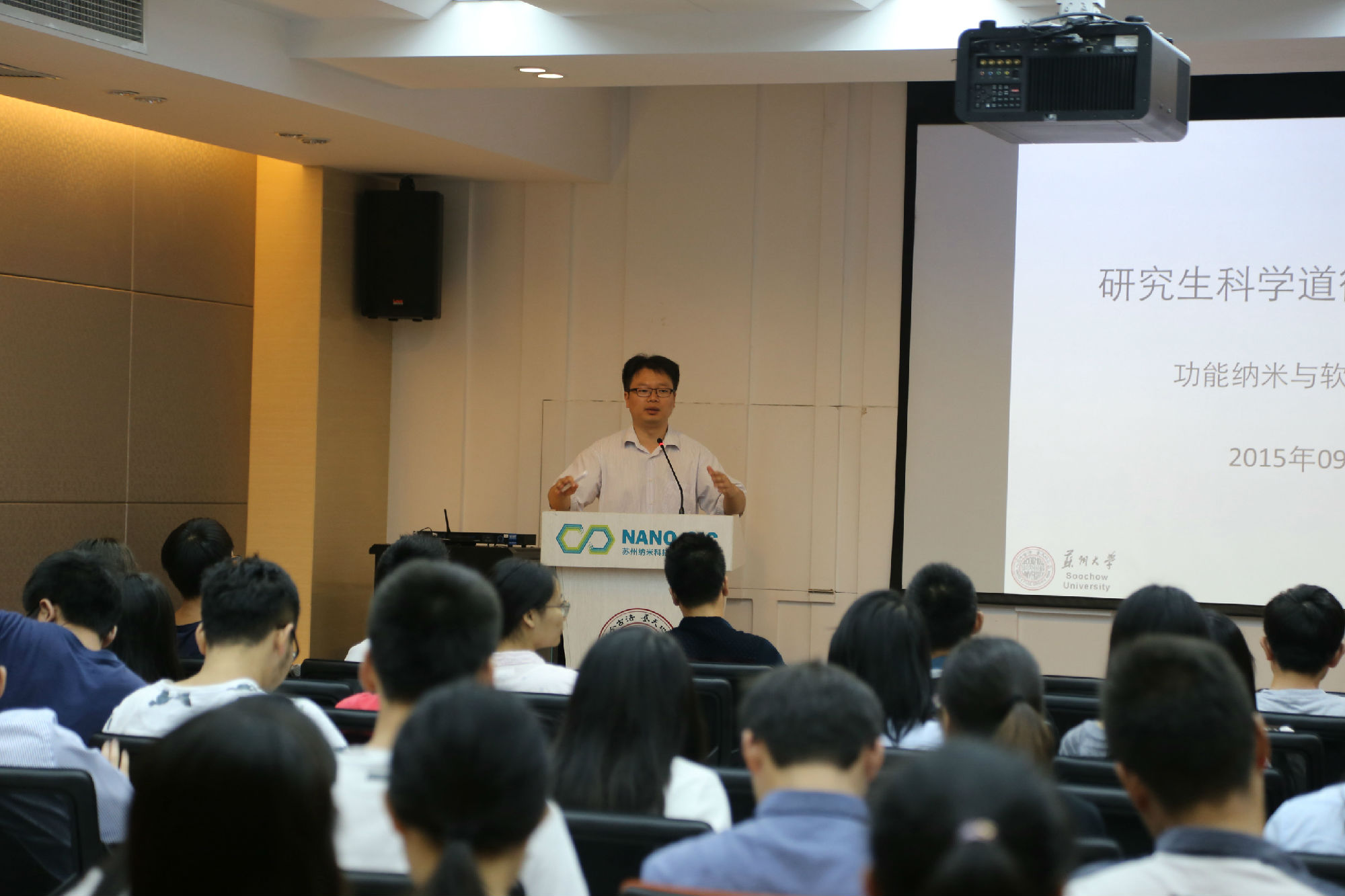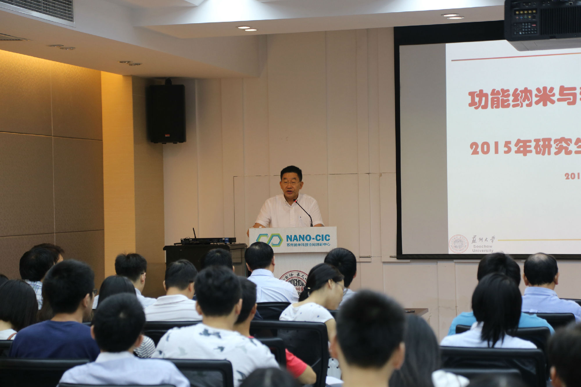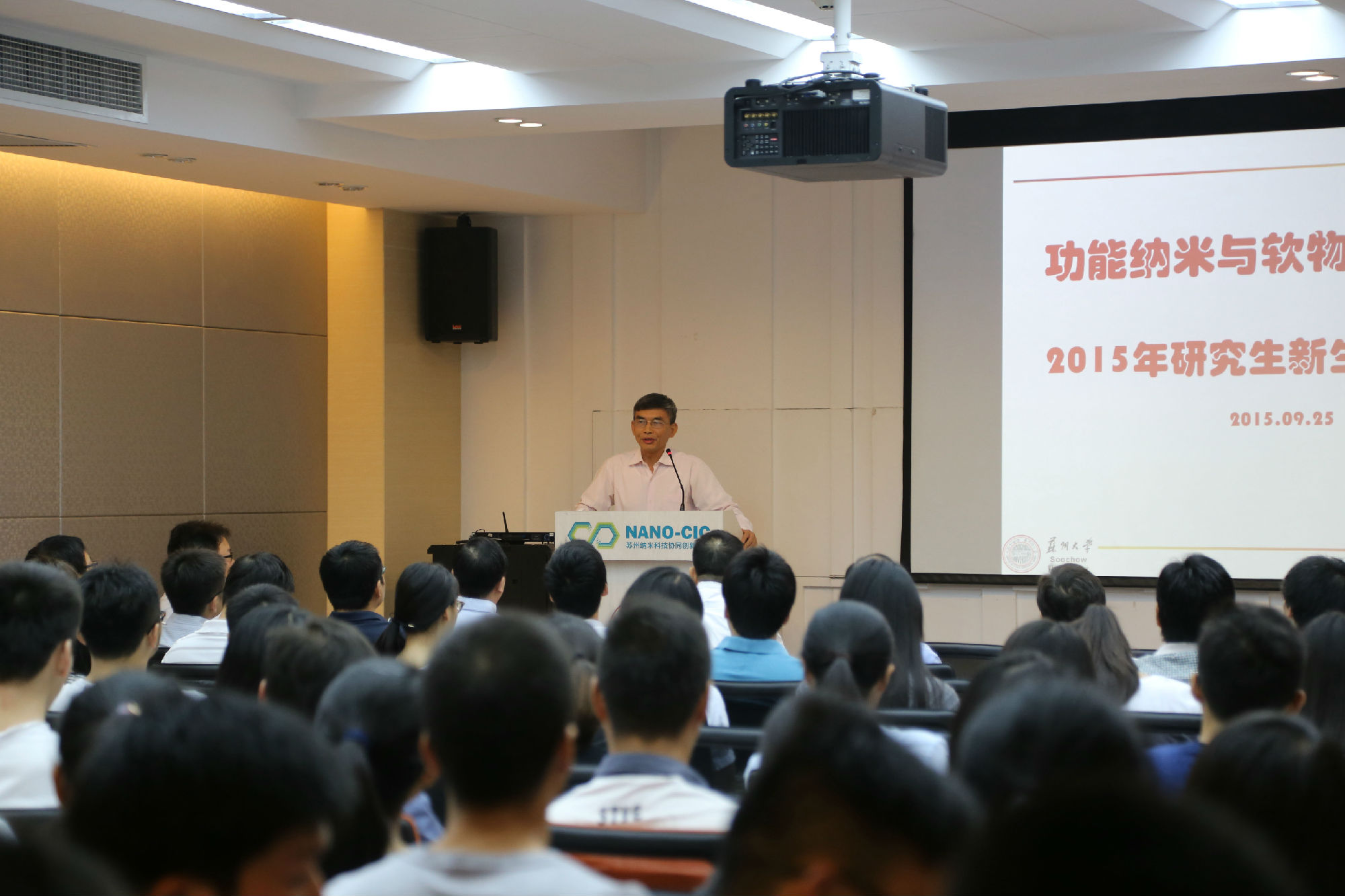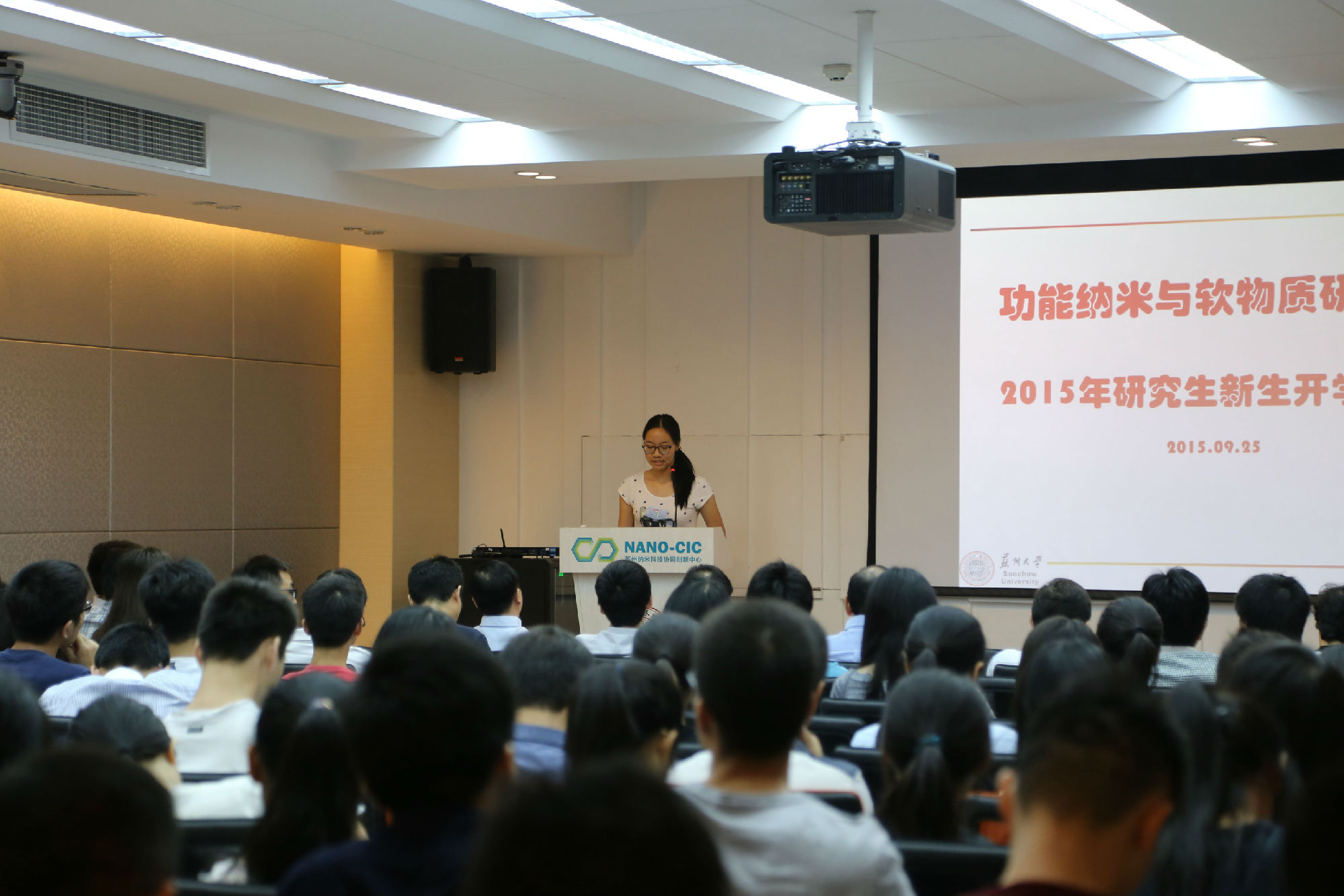 On September 25, 2015, the Institute of Functional Nano and Soft Materials held the opening ceremony in the conference room of Building 909. All 146 freshmen including master students and doctoral students took part in this gathering. The vice dean of FUNSOM, Prof. Zhuang Liu, hosted the meeting. The Dean of CNST, Lee Shuit-Tong, and professors of the college gave welcome speeches.