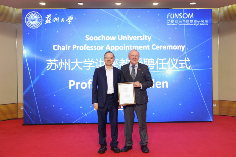 On the morning of October 15th, the appointment ceremony and academic seminar for Academician Klaus Müllen from the Max Planck Institute for Polymer Research as a chair professor was held in the Academic Report Hall of the Binglin Library at the Dushu Lake Campus. In attendance were Shen Mingrong, Deputy Party Secretary and Vice President of the university; Li Shutang, Academician of the Chinese Academy of Sciences and Director of our college; and Chi Lifeng, Academician of the Chinese Academy of Sciences and Advisory Director of our college.