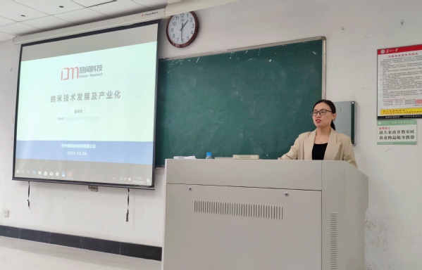 To strengthen the link between industry and academia while cultivating top-tier innovators, our college invited Zhang Pingping—a Jiangsu Provincial Undergraduate Industry Professor, Deputy R&D General Manager at Jiangsu Huiwen Nanotechnology Co., Ltd., and a distinguished alumna—to deliver a lecture titled “Nanotechnology Development and Industrialization” to the Class of 2023 on October 25. The lecture was moderated by Assistant Dean Wang Lu.
